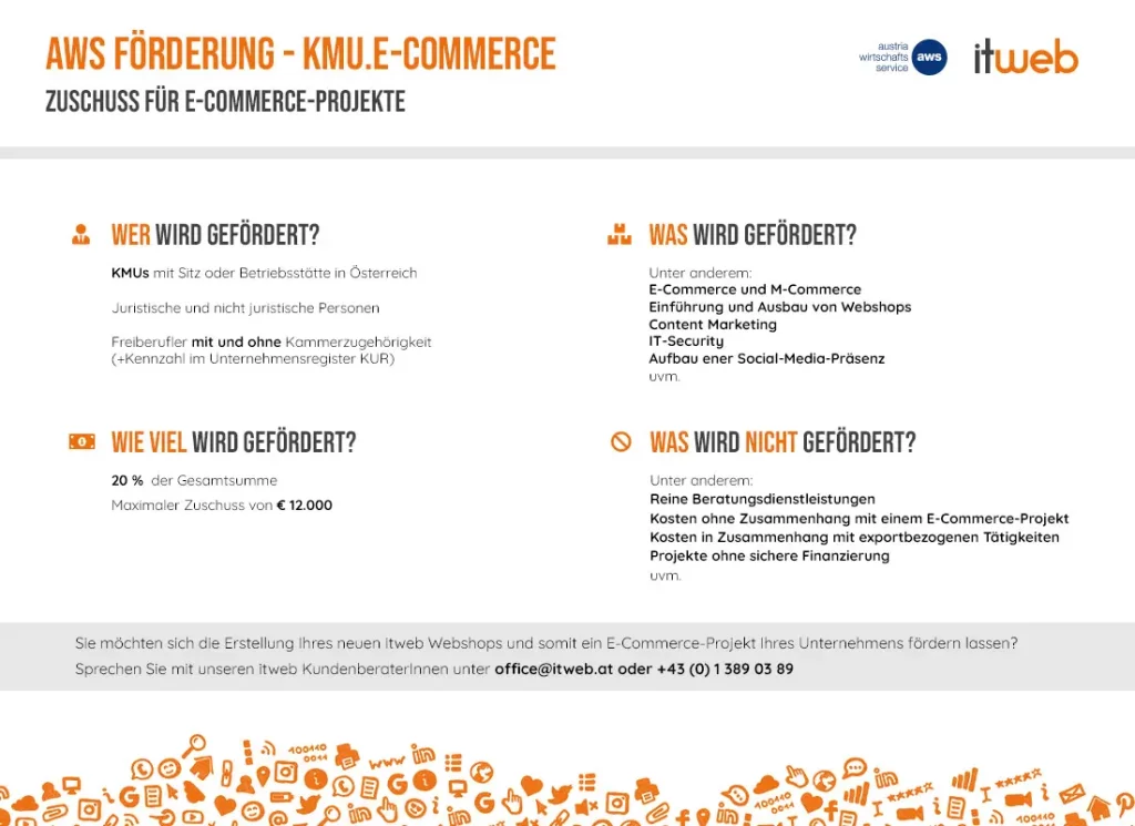 Die Förderung KMU.E-Commerce der aws richtet sich an österreichische Klein- und Mittelbetriebe, die konkrete Vorstellungen über ihr nächstes Digitalisierungsprojekt haben. Förderfähig sind Projekte wie Onlineshops oder Social-Media-Tools in der Höhe zwischen € 3.000 und € 60.000. Der maximale Zuschuss liegt bei € 12.000. Damit soll ein Anreiz für Investitionen in den Bereichen E Commerce und der digitalen Transformation geschaffen werden.