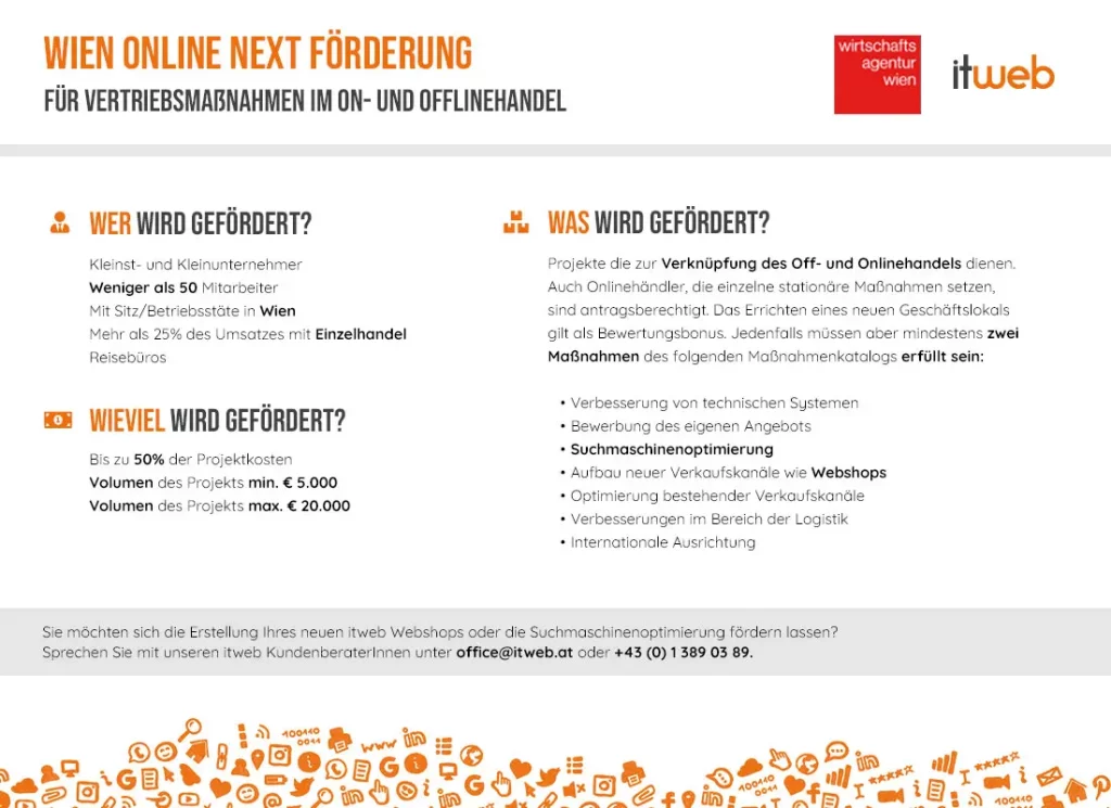 Wenn Sie Fragen zu dieser Förderung haben, können Sie direkt bei der Wirtschaftsagentur Wien anfragen. Sollten Sie ein Projekt mit itweb planen, etwa einen Onlineshop oder Suchmaschinenoptimierung, helfen wir Ihnen auch gerne bei der Antragsstellung.